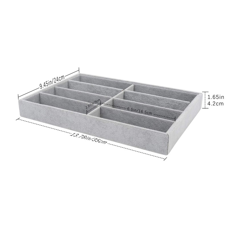 **Description:** ♦ 8 grids can help you neatly organize and display your glasses, watches or jewelry. ♦ The inner divider can be rearranged to adjust the size or number of compartments to meet your needs. ♦ Made of sturdy composite board and soft sleek ice velvet materials, giving the best protection to your accessories. ♦ The grey ice velvet is elegant in look and perfect to highlight your accessories. Ideal for home, stores, trade shows, etc. **Specifications:** ♦ Material: Ice Velvet + Composite Board ♦ Dimensions: 6.5" x 1.97" / 16.5cm x 5cm for each grid. 13.78" x 9.45" x 1.65" / 35cm x 24cm x 4.2cm (LxWxH) for the whole. **Package Includes:** 1 x Tray