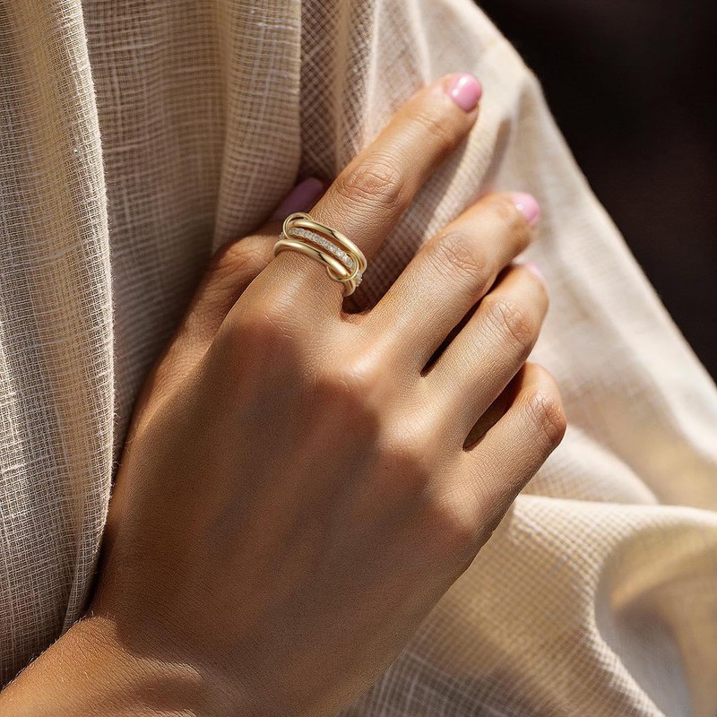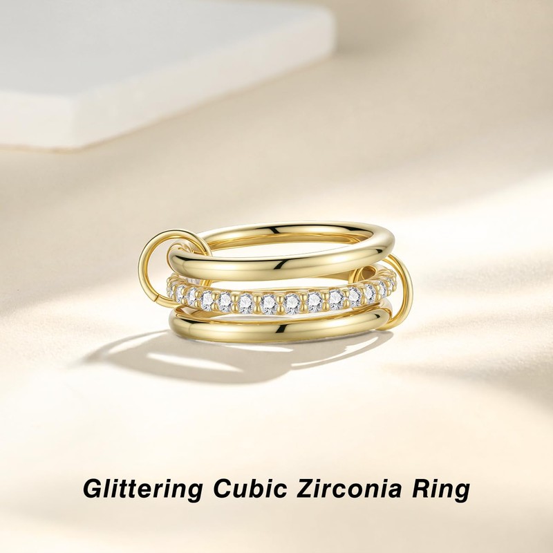 - Design Inspiration: This gold rings for women consists of three layers of rings. Two layers of gold with cubic zirconia rings and one layer of plain gold rings are connected by two smaller rings to create a stylish and unique piece of jewelry. Sparkling cubic zirconia shines on your fingertips, showing off your elegant and noble temperament.