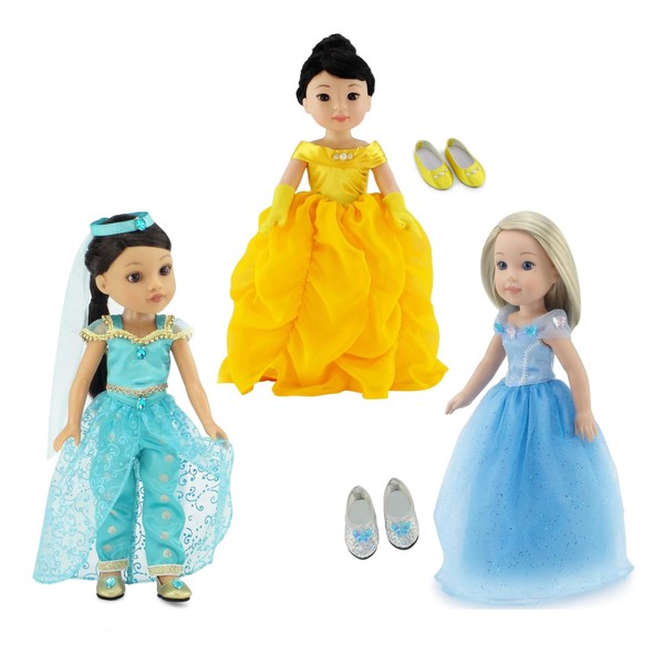 - Feature description: Beautiful 9-piece 14" Doll Princess fashion value bundle gift set, including a blue sparkly Cinderella-inspired ball gown with sparkly shoes, golden yellow princess Belle-inspired gown with elegant matching gloves, and a gorgeous Jasmine-inspired princess set with one of a kind shoes and head piece!