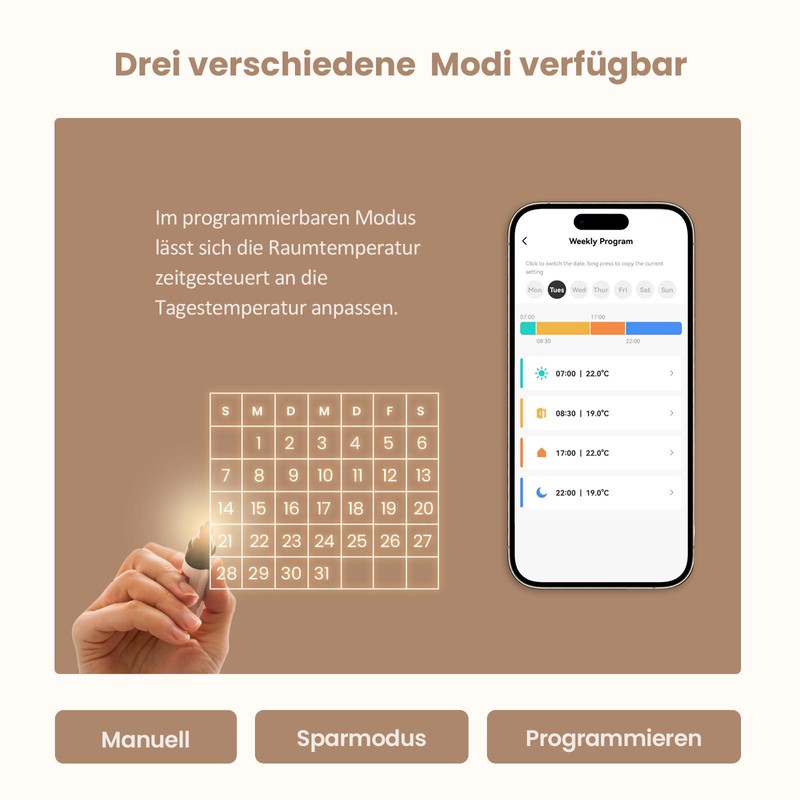 - High performance: the intelligent radiator thermostat offers numerous practical functions such as frost protection, child lock, window detection, temperature calibration and history overview. Choose between automatic mode, manual mode, comfort mode and energy saving mode, including a programmable mode for timed temperature control - for a smarter and more comfortable life