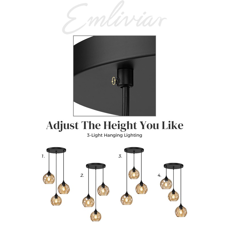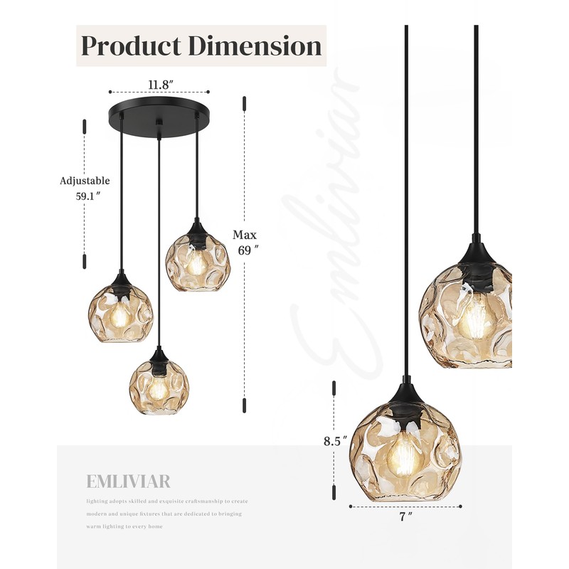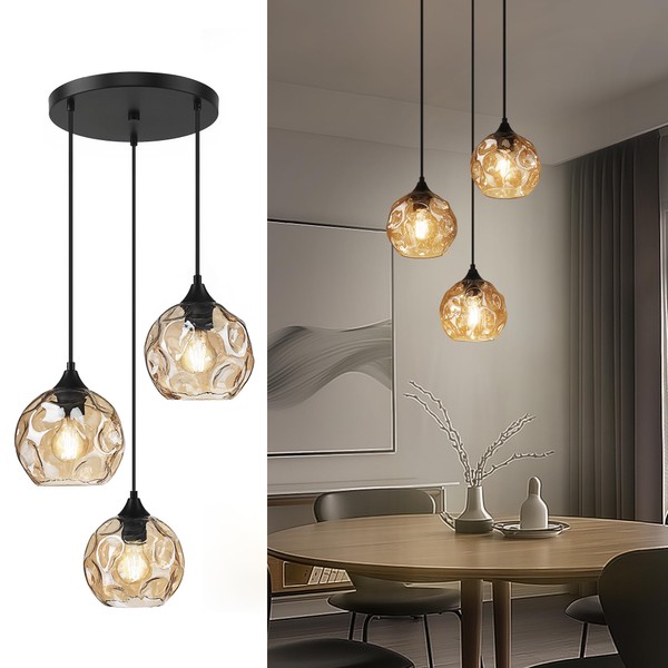 Emliviar 3-Light Cluster Pendant Lamp with Hammered Glass, Linear Barn Hanging Pendant Lighting for Dining Room in Amber Finish, DYE287G2-3 BK
