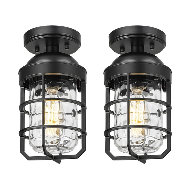 Emliviar Black Semi Flush Lights for Entryway, 2-Pack Rustic Light Fixtures Ceiling Mount with Water Ripple Glass Shade, GE255LF-2PK BK-WG
