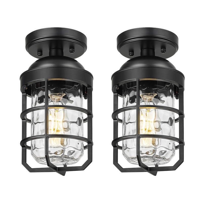 - These ceiling mount lights feature a nautical-style metal cage design with a black finish and water ripple glass to protect the bulb for long-lasting use.