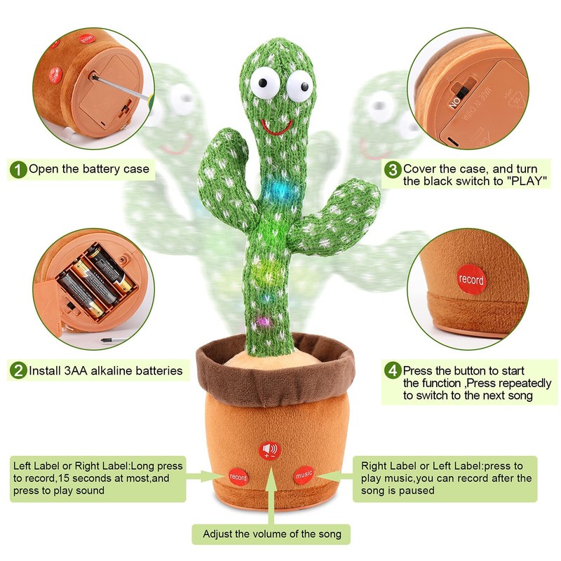 - 【Cactus Toy Process】: 1. At the bottom, remove the screw with a screwdriver, install AA batteries 3 pack, and tighten the screw.Black button at the bottom:ON; 2. Press the label button on the cactus,cactus can sing; 3 . Press repeatedly to switch to the next song ; 4.Left Label or Right Label:Long press to record,15 seconds at most,and press to play sound --- Right Label or Left Label:press to play music,you can record after the song is paused; 5.Middle label:Adjust the volume of the song