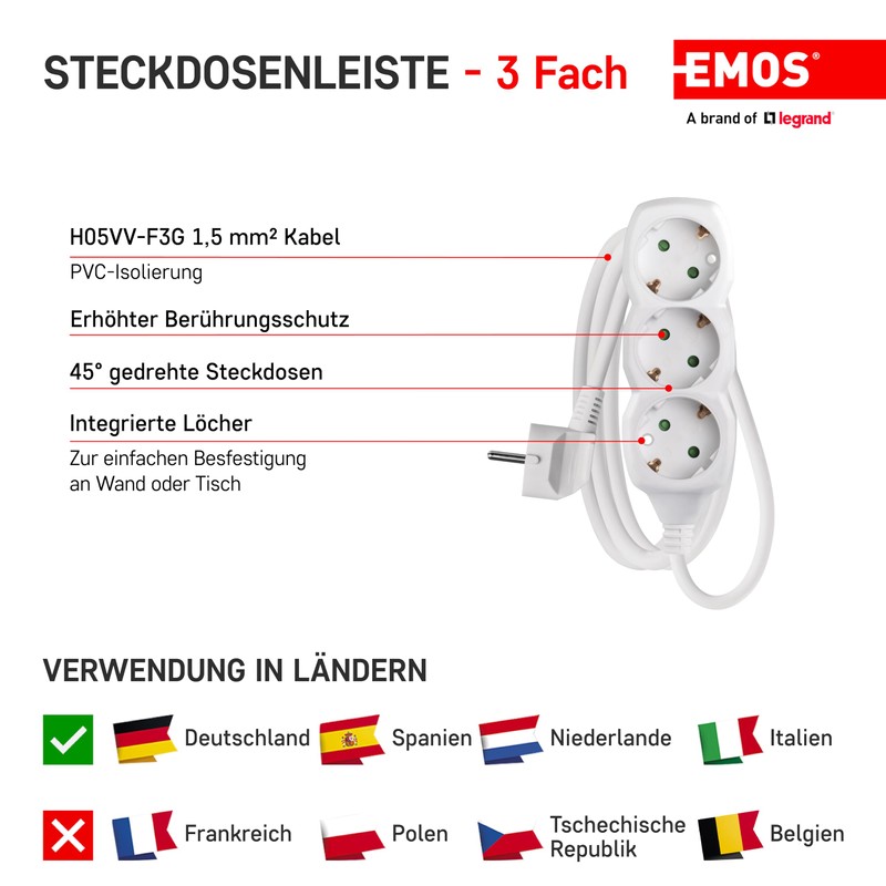 Die EMOS 3-fach Steckdosenleiste mit einer Kabell?nge von 3 m und 45?? gedrehten Steckdosen bietet eine zuverl?ssige Stromversorgungsl?sung f??r den Innenbereich. Ausgestattet mit 3?? 2P + PE Schuko-Steckdosen, 250 V, 16 A und einer maximalen Belastung von 3680 W, ist diese Mehrfachsteckdose ideal f??r den Einsatz zu Hause oder im B??ro. Sie verf??gt ??ber einen erh?hten Ber??hrungsschutz, die zus?tzliche Sicherheit bietet. EMOS bietet eine breite Palette von Verl?ngerungskabeln, Kabeltrommel und Steckdoseleistungen an, die f??r jede Situation geeignet sind. Egal, ob f??r den Garten, die Baustelle oder industrielle Anwendungen - EMOS hat die passende L?sung parat. Jede Kabeltrommel zeichnet sich durch besondere Merkmale wie verschiedene L?ngen, Schutzarten und Materialien aus, um den spezifischen Anforderungen der Nutzer gerecht zu werden. EMOS verfolgt das Motto "Making Life Easy". Dies spiegelt sich in der Entwicklung praktischer und zuverl?ssiger Produkte wider, die den Alltag erleichtern. Mit einer Fokussierung auf Qualit?t, Sicherheit und Benutzerfreundlichkeit strebt EMOS danach, L?sungen zu bieten, die den Anforderungen der Kunden entsprechen und ihren Lebensstil bereichern.