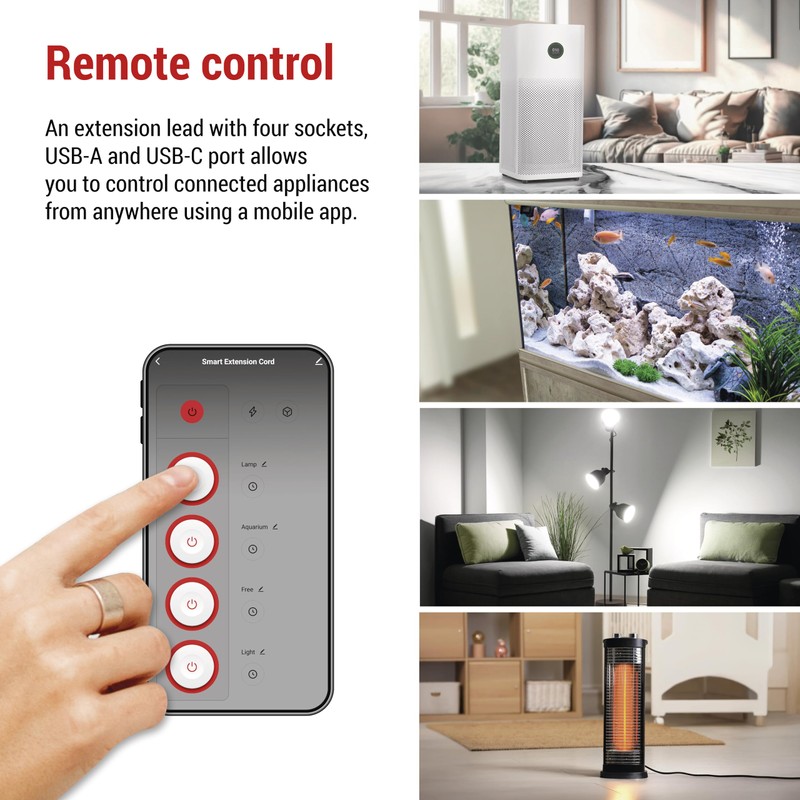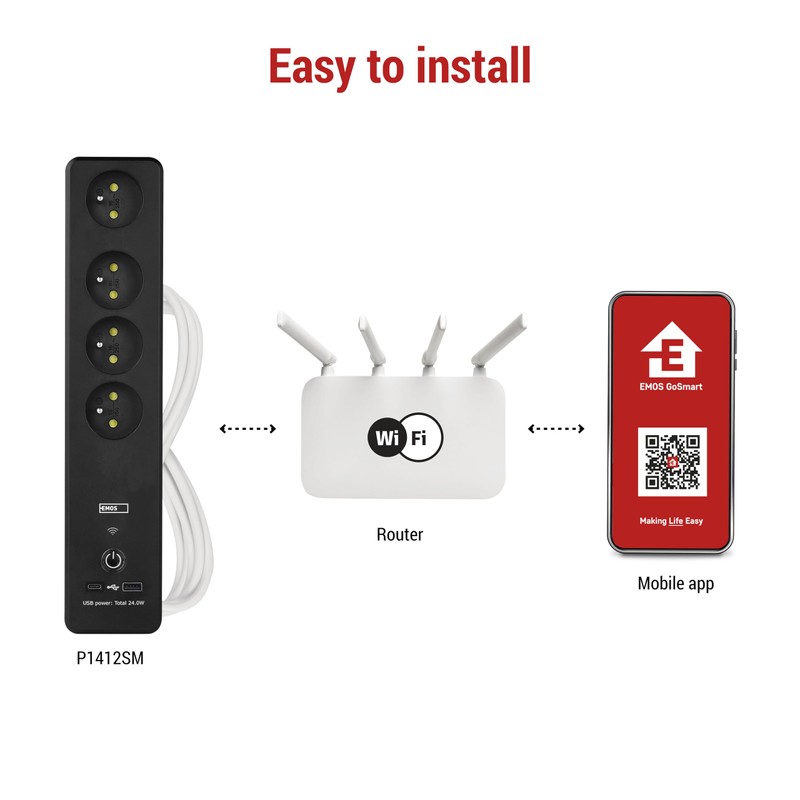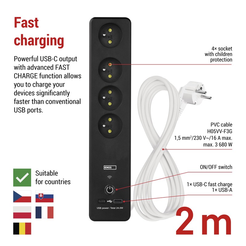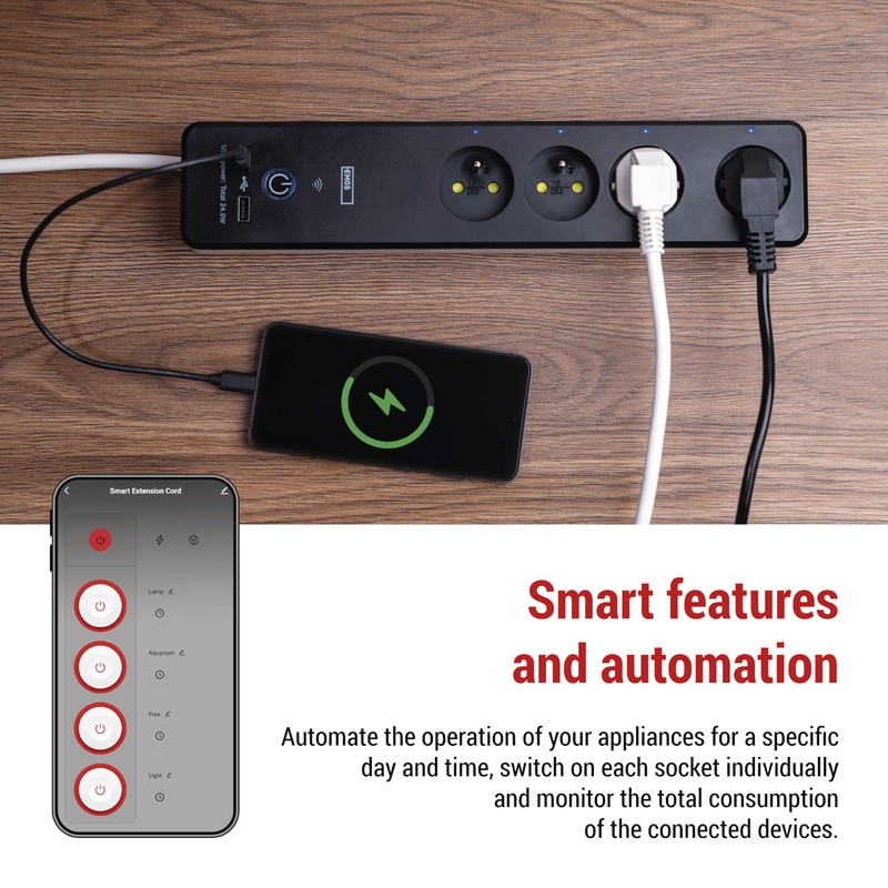 EMOS GoSmart - 4-Way Power Strip with WiFi and App - 2 m Smart Home WLAN Power Strip French with 2 USB Ports (USB-C, USB-A), Switch, Wattage Meter and Timer - Compatible with Alexa, Google Assistant