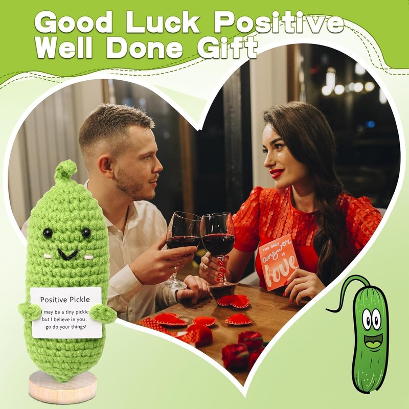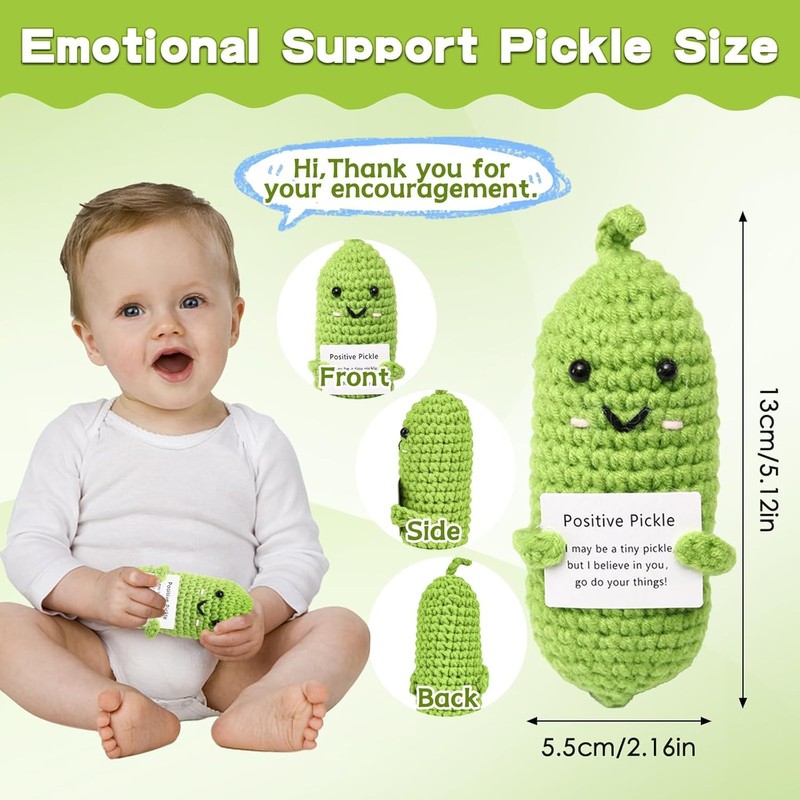 - đ„ăEmotional Support Pickleă This emotional support pickle is crafted from soft wool yarn and comes with heartwarming message cards. When you feel down and discouraged, it will provide you with strong emotional support, making you feel warm and comforted. Perfect gift for family, sister, friends, girlfriend, kids or patients.