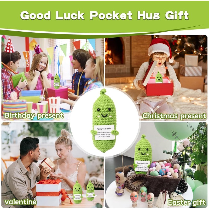 - đœăGood Luck Pocket Hug Giftă Whether you want to reward someone's achievements or surprise a friend with a thoughtful gesture, these smiley pickles decorations are an excellent choice. Good luck charm, positive gifts, motivational gifts, new job gifts, positive tomato gift, funny gifts for friends, good luck gifts for women, paramedic gifts, cute gifts for girlfriend, Halloween gifts, Christmas gifts, New Year gifts. It is so cute and surprising to your friends, family and children.