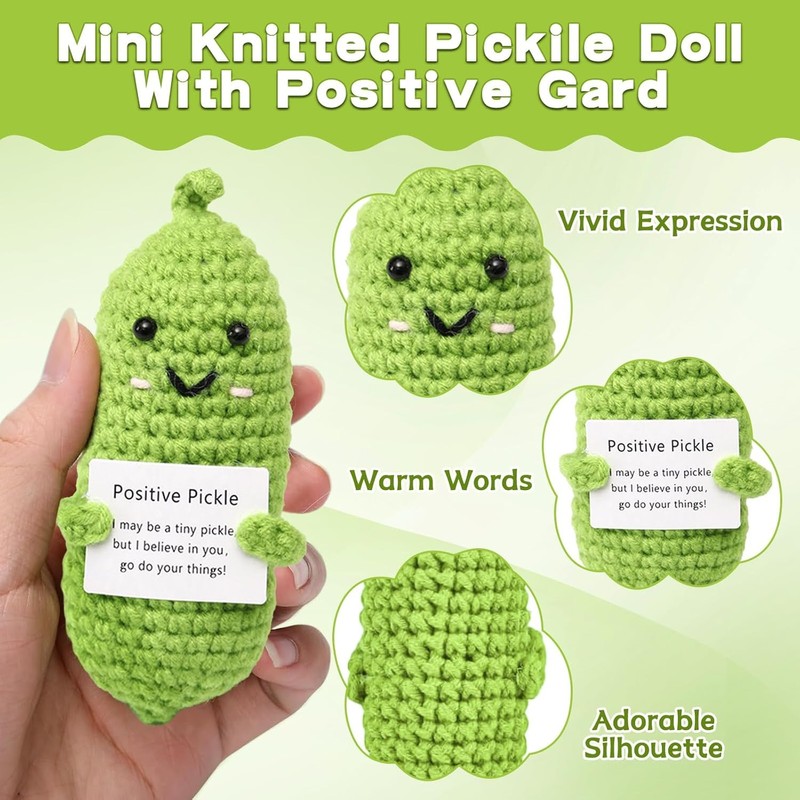 --The Funny Positive Pickle Doll is a cute and heartwarming knitted doll that comes with a set of positive affirmation cards.
