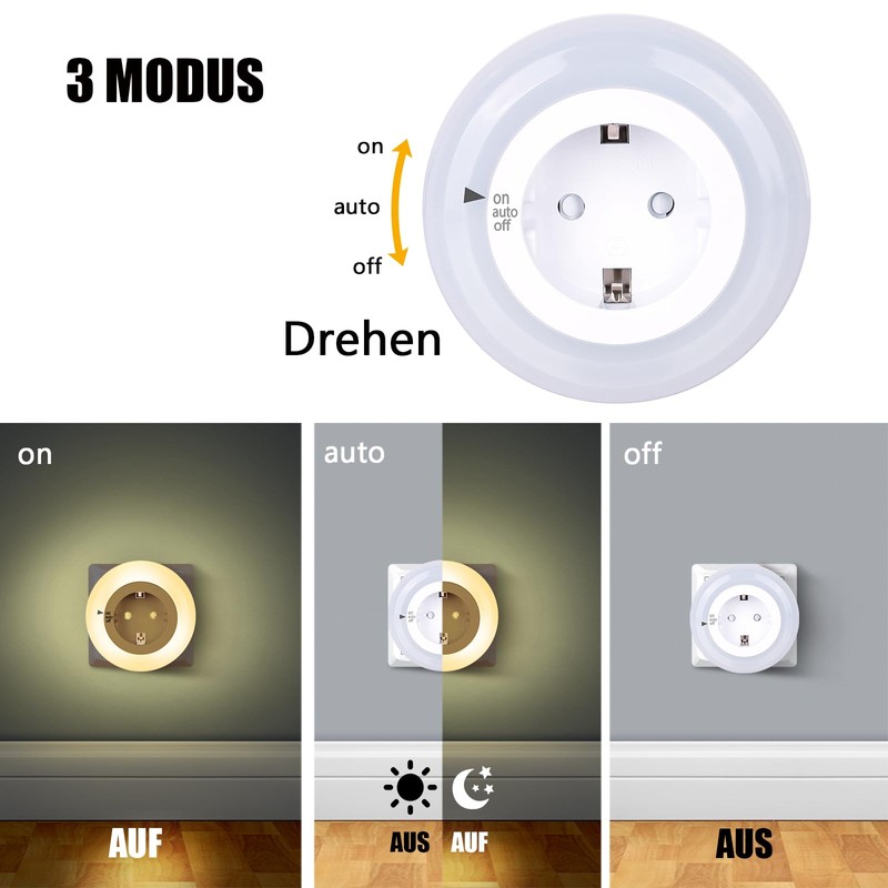 - [3 Modus Auto/ON/OFF]: AUTO: Eingebaute intelligente und umweltfreundliche D?mmerungssensor. Das Licht schaltet automatisch an der Abendd?mmerung ein und am Morgengrauen aus. Dieses Nachtlicht aktiviert sich nur in der Dunkelheit und schaltet ab, wenn Ihr Raum vom Sonnenlicht oder Deckenbeleuchtung hell erh?lt. ON: Betriebsanzeige an; OFF: Ausschalten.
