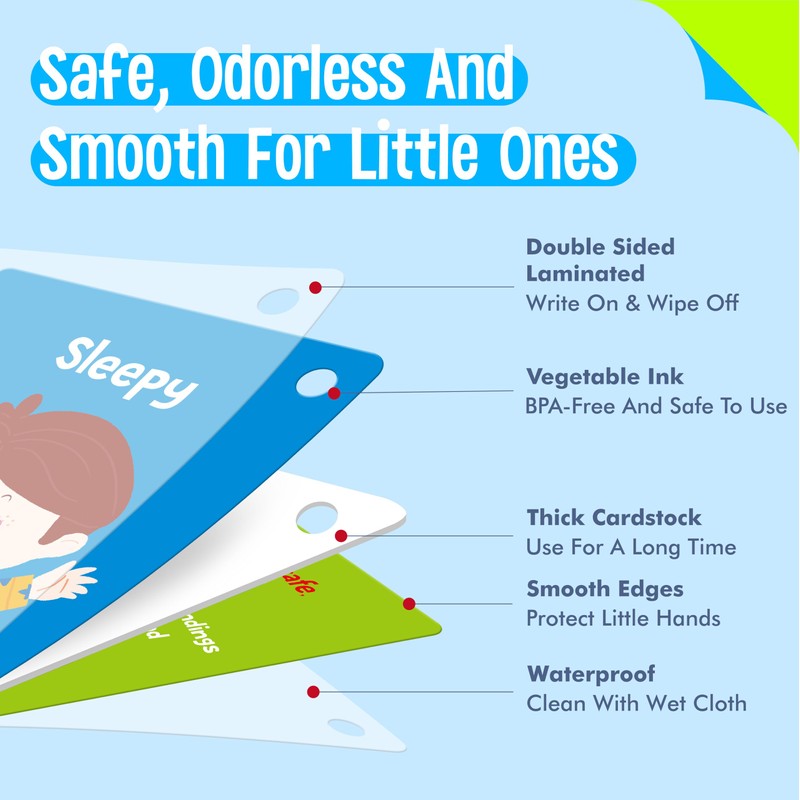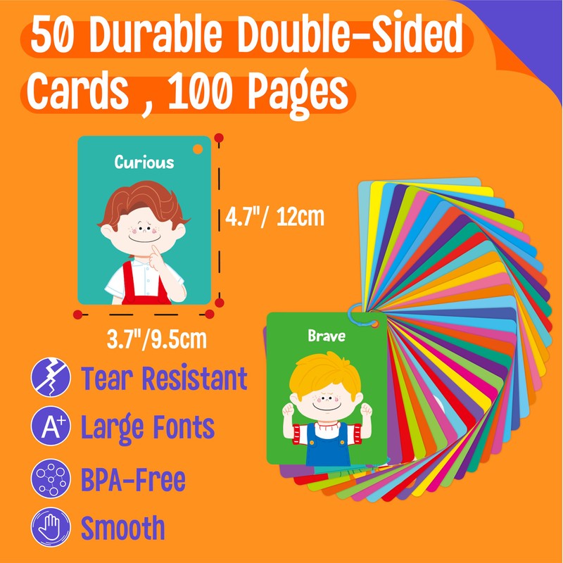 • 50 Different Emotions: The flashcard set has 50 different moods, like happy, sad, surprise, angry, hopeful, embarrassed, scared, frustrated, grumpy and other feelings. It adopts expressive faces of cartoon characters, kids can get and learn the emotion more directly. The image captures the attention of children and makes it easy for them to connect with their feelings.