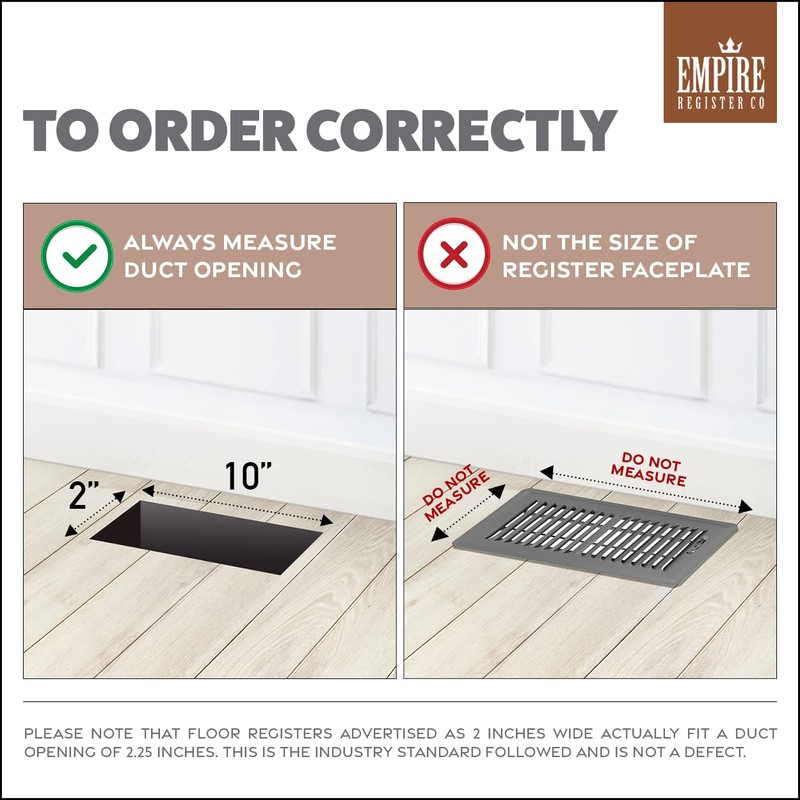 - PRODUCT DIMENSIONS - The size of this floor register is 2 inch x 10 inch. To determine size needed, measure air duct opening rather than old register. The overall size of the faceplate is 3.75 inch x 11.5 inch. Our floor registers are crafted from 2mm thick steel that can withstand up to 300 pounds of walking weight. They feature a premium finish that resists rust and corrosion & ensure long-last.