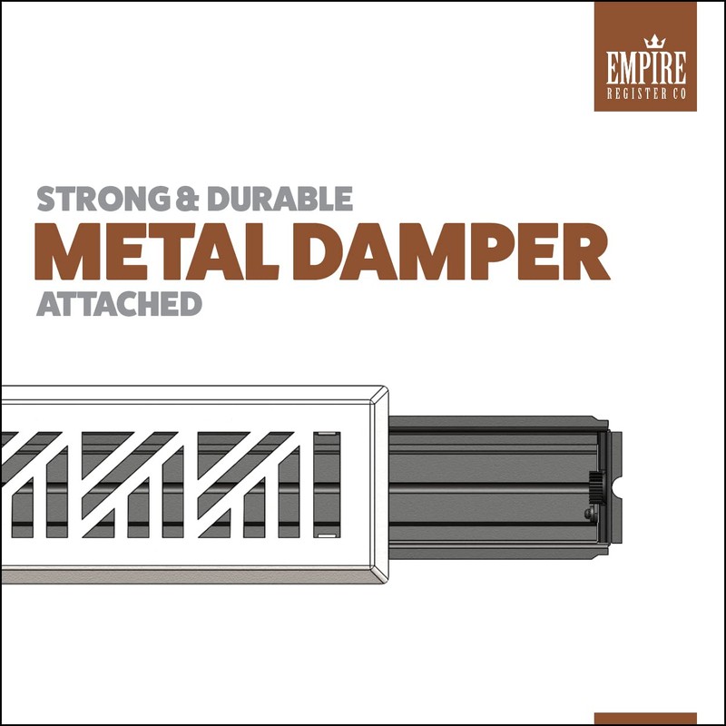 - STEEL DAMPER ATTACHED - These vent covers for home floor have sturdy steel construction, powder-coated steel damper attached for durability, longevity, are smooth, shiny, and have no sharp edges. These air vents are crafted for long trouble free operation, rigid extra heavy duty to withstand constant walk on situations