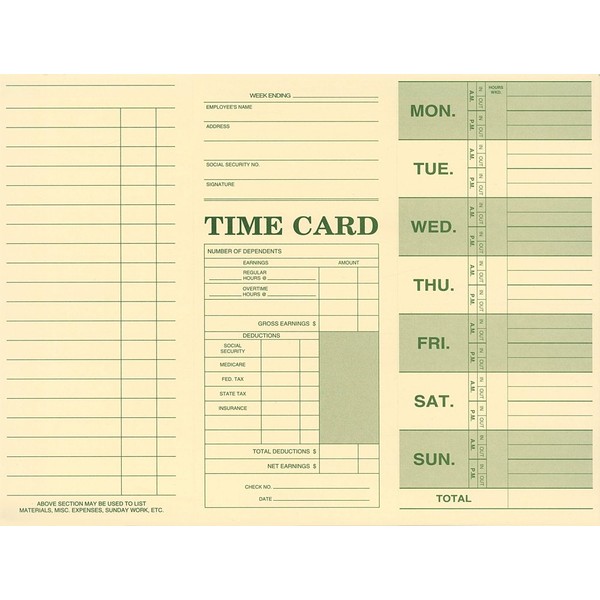 - Folds to 3-1/2" x 7-7/8" - Fill out either by hand or in time clock machine - Tracking employee attendance made easy. Track hours and wages with our weekly time cards! - List up to 13 jobs daily, Monday through Saturday.
