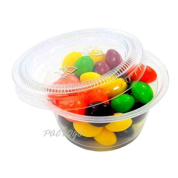 Empress 2 fl.oz. capacity clear plastic portion cups. Cups made with high quality polypropylene (PP5). Lids made with high quality clear PETE. Dimensions: 2-1/2" Top Out x 1-1/4" Depth x 1-3/4" Bottom. Matching lids included.