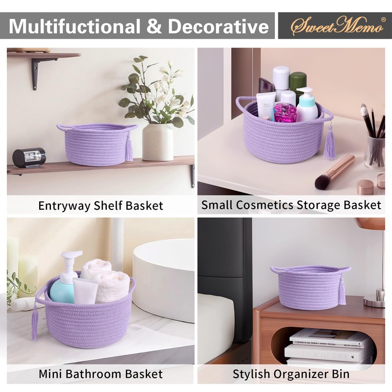 - 【Desk & Bedside Organizer for Girls】This soft purple rope basket adds a dreamy touch to your vanity, desk, or nightstand. Use it to store makeup, jewelry, stationery, or bedtime items like lip balm and scrunchies. The compact size makes it a cute and functional bedside storage bin, catchall tray, or gift basket for girls, especially in pastel-themed rooms or dorms.