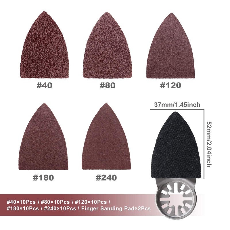 -[Package List]: Kit includes 2 pcs 52x37x7mm finger sanding pads and 50 pcs finger sanding sheets. Includes 40/80/120/180/240 grit, 10 pieces of each grit.