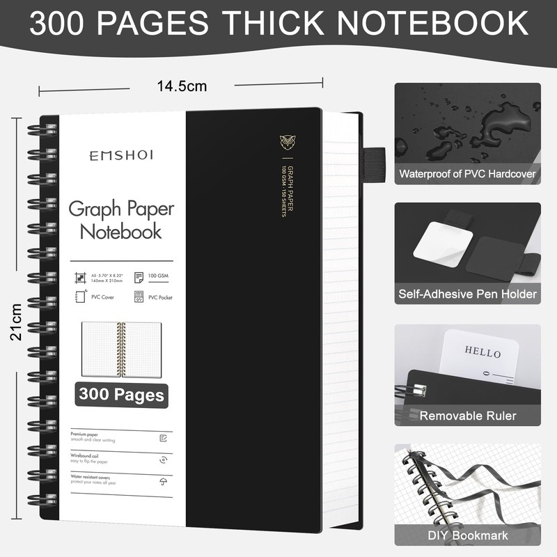 EMSHOI Notebook A5 Squared Spiral Notepad with 300 Pages / 150 Sheets, 100gsm Checked Paper for Writing, PVC Hard Cover, Notebooks for School, Work, Drawing, Travel, 14.5 x 21 cm - Black