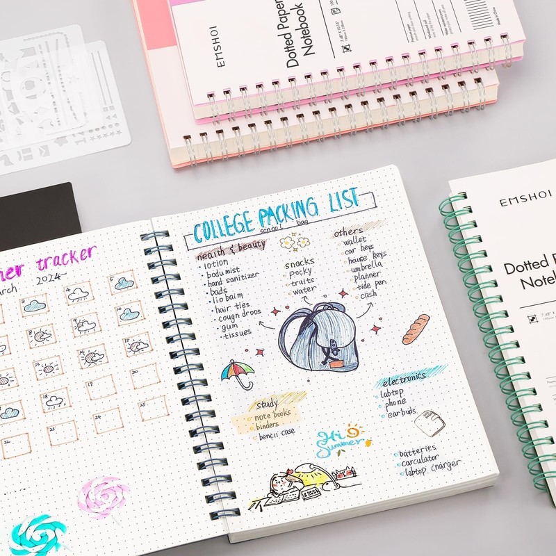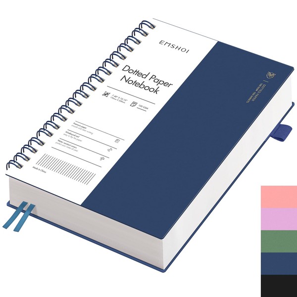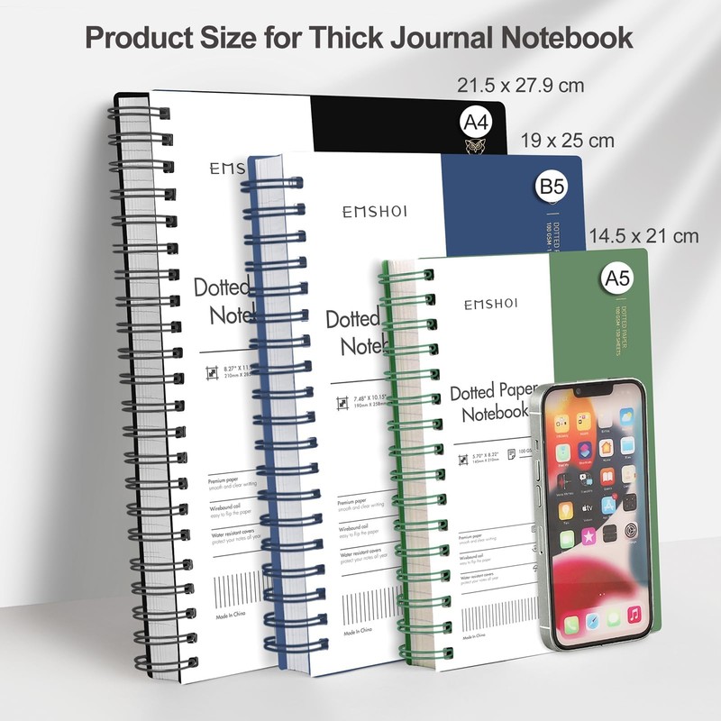 - Premium spiral notebook: EMSHOI notebook B5 (19 x 25 cm). The sturdy spiral binding and waterproof PVC hard cover protect 300 pages/150 sheets of high-quality dot grid paper from wear and damage.