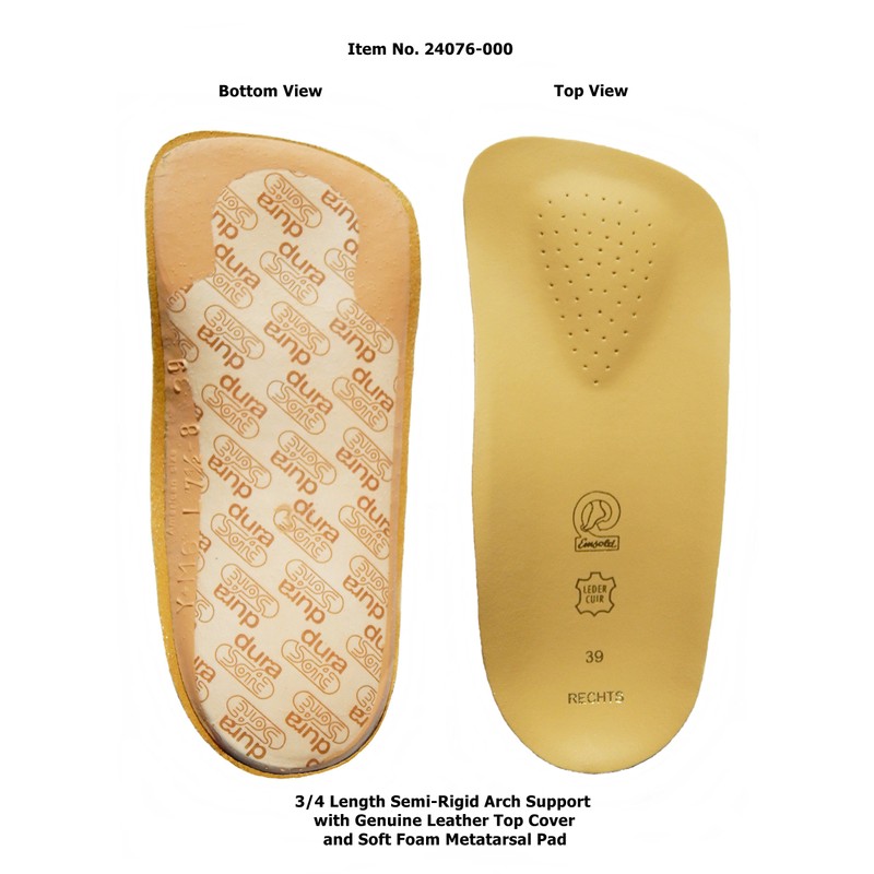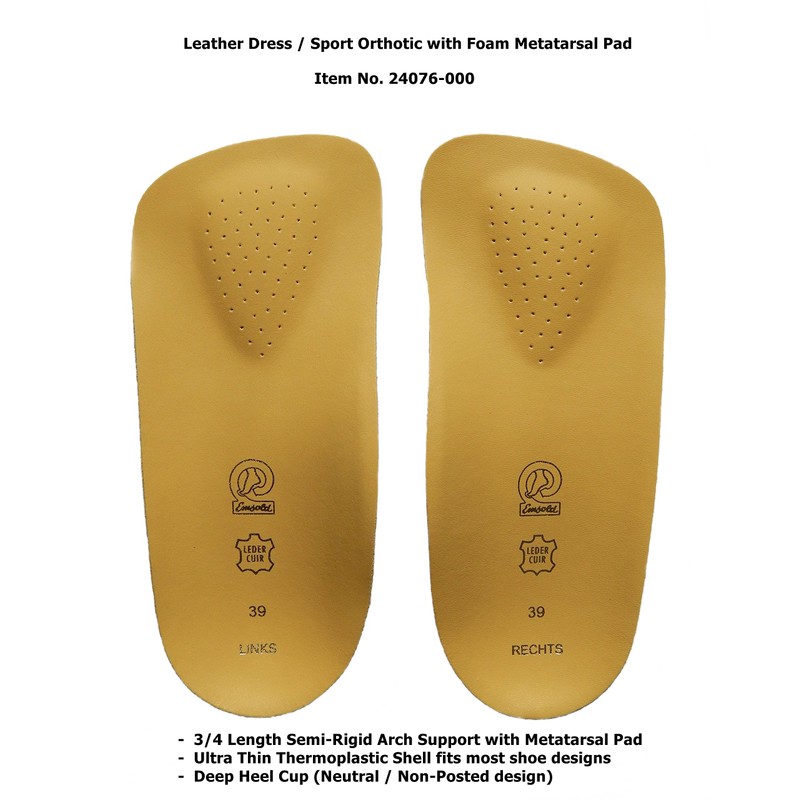 Combat your foot pain and discomfort with these thin yet effective orthotic inserts. Equipped with semi-rigid arch support, soft foam metatarsal pads, deep heel cups, and genuine leather top covers, the Emsold Ultra Thin Orthotics are designed to relieve your pain and discomfort. If the bottom of your foot is inflamed and you are experiencing the intense heel pain associated with Plantar Fasciitis, these inserts are designed to alleviate your symptoms by providing support of your medial arch. The deep heel cup design can help prevent mild pronation and/or supination by keeping your foot in proper alignment; thus preventing your foot from rolling in or out during the gait cycle. The raised metatarsal pads included in these orthotics will provide support of the transverse arch and help spread and support the metatarsal heads to relieve pain associated with Metatarsalgia (Capsulitis), Morton’s Neuroma, and other conditions causing pain in the forefoot area or under the balls of your feet. These shoe insert pads have a biomechanically correct design with integrated metatarsal pads for your foot. You can be on your feet all day and experience a whole new level of comfort. The genuine leather cover wicks away moisture caused by perspiration and helps to maintain a healthier and drier environment. As well as being comfortable, the leather cover keeps a durable barrier between your foot and the semi-rigid plastic insole beneath it. Do not let Plantar Fasciitis or Metatarsalgia limit your activities and keep you sidelined. You can return to the active life you’ve always wanted with these functional orthotic shoe inserts from Emsold (Item No. 24076-000).