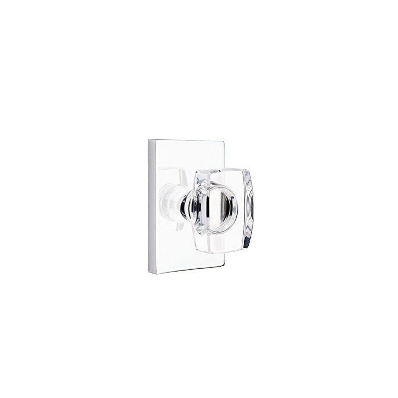Emtek Privacy Set, Modern Rectangle Rosette, Modern Windsor Crystal Knob Fits any door between 1-3/8” to 2-1/4" thick with a 2-1/8" bore standard door prep Standard latch is for 2-3/8" backset. Specify 2-3/4" backset if required Sold as complete set. Includes Latch and Strike Plate
