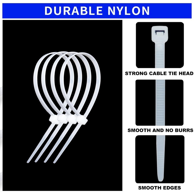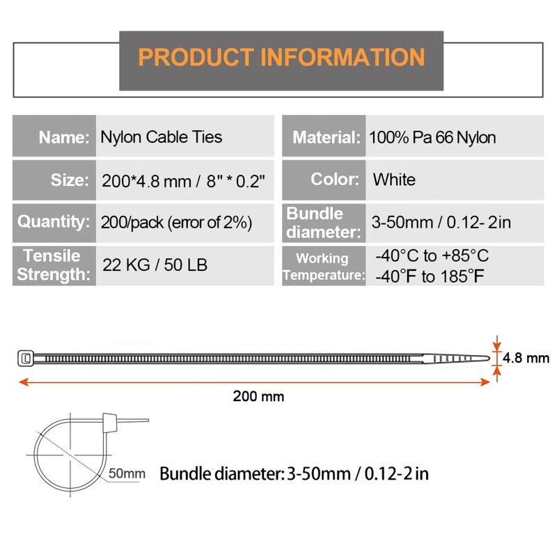 - 【Size and Quantity】 Nylon Cable Ties, White, 200mm long, 4.8mm wide, 200 pieces per pack, Tensile Strength: 22kg.