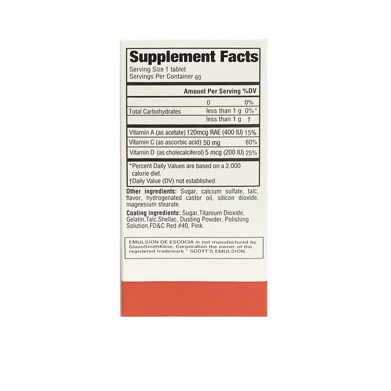 EMULSION DE ESCOCIA Cod Liver Oil, Dietary Supplement, Vitamins A, B1, D and E, Immune System Support, Cherry Flavor (60 Tablets/Pack of 1)
