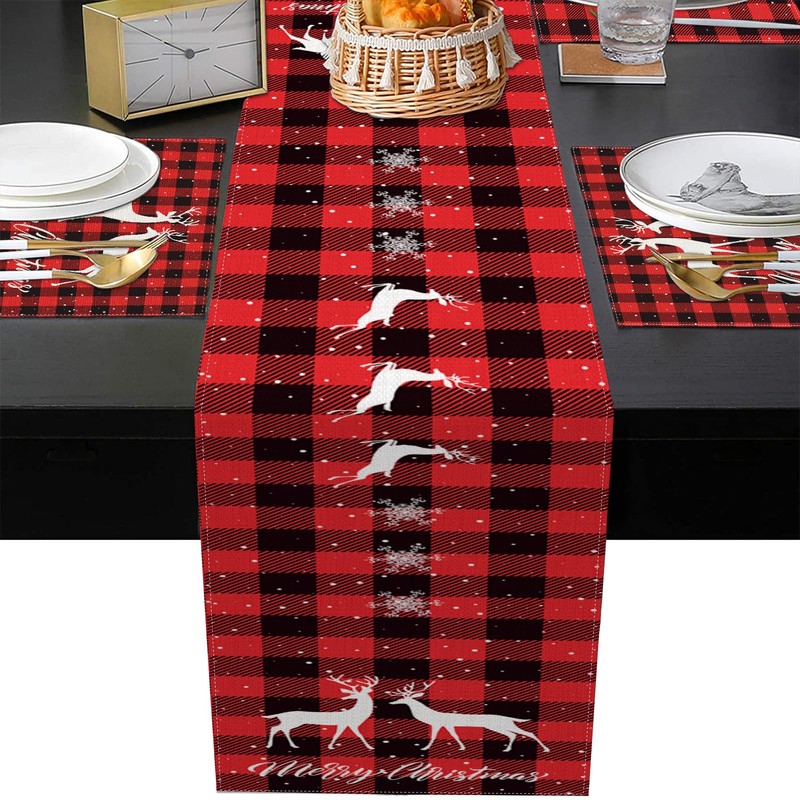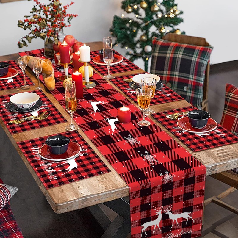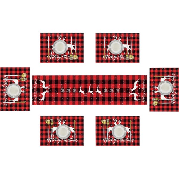Emvency Merry Christmas Table Runner and Placemats Set of 6, Reindeer and Red Buffalo Plaid Dining Table Decor for Daily Use(1 Table Runner 72 inches Long and 6 Placemats)