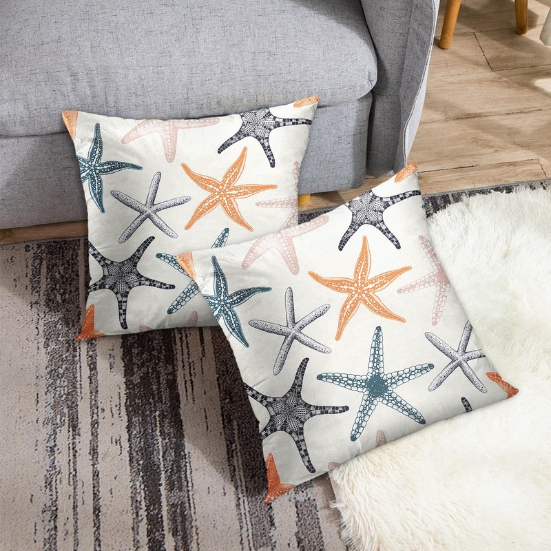 Emvency Set of 2 Starfish Throw Pillow Covers Beach Ocean Coastal Orange Black and Blue Decorative Pillow Cases Home Decor Standard Square 20x20 Inches Summer White Pillowcases
