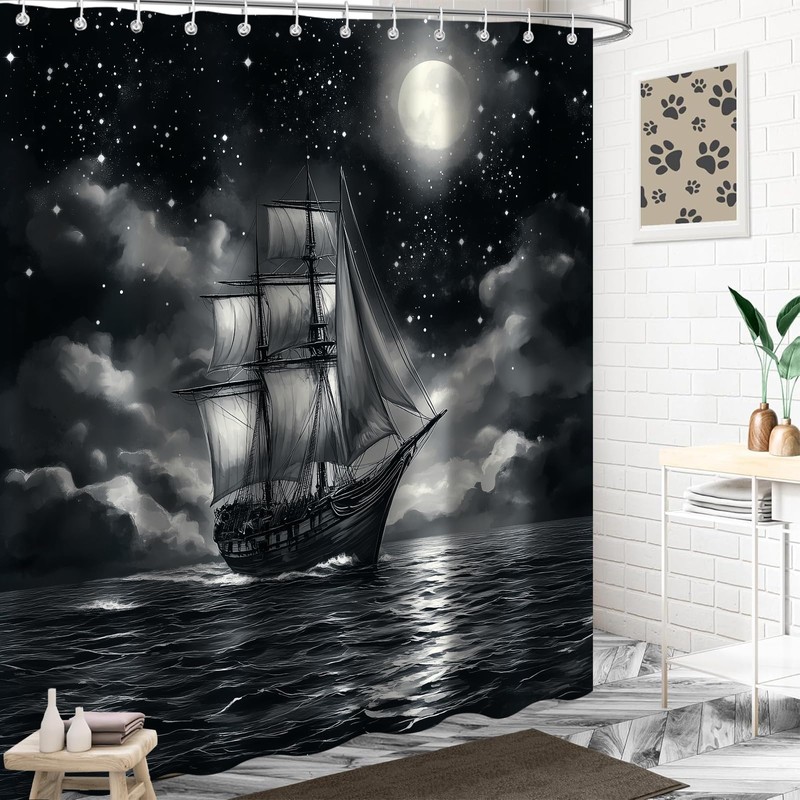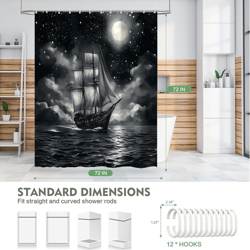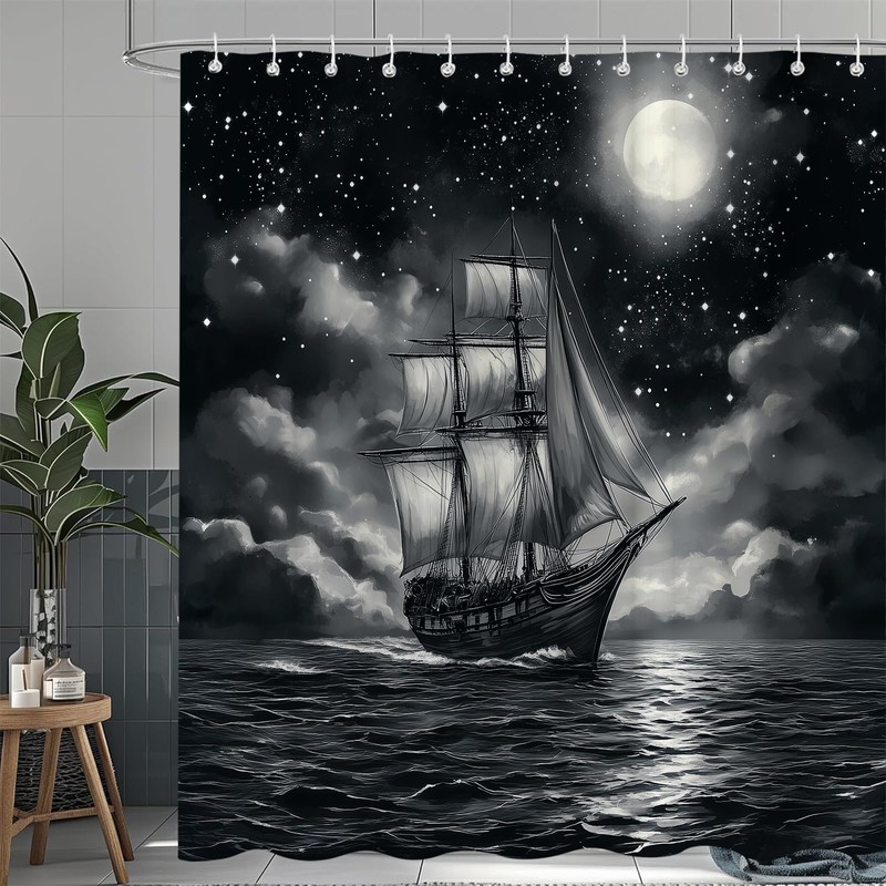 Emwnodti Nautical Sailboat Shower Curtain, Coastal Ocean Theme Black Starry Sky Moon Bathroom Accessory Set, Polyester Fabric Waterproof Bath Curtain 72x72 Inch with 12 Hooks