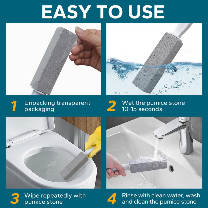 - Convenient and Effective: Simply unwrap the transparent packaging film, wet the pumice stone, and vigorously wipe the stained area. No need to add any chemicals. Rinse with water for effortless cleaning. The pumice stone for toilet bowl cleaning leaves no residue, effortlessly eliminating stubborn stains caused by calcium buildup, hard water, limescale, rust, iron, soap, and dirt.