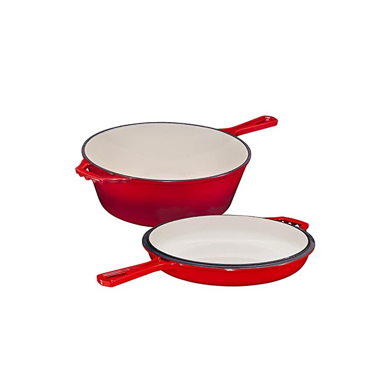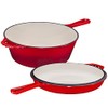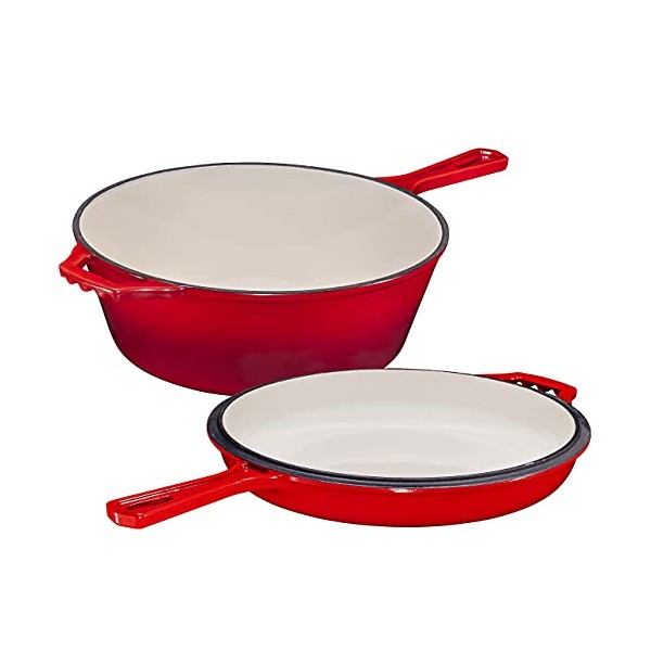 Enameled 2-In-1 Cast Iron Multi-Cooker – Heavy Duty Skillet and Lid Set, Versatile Non-Stick Kitchen Cookware, Use As Dutch Oven Or Frying Pan, 5 Quart, Red