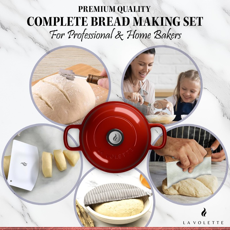 Enameled Cast Iron Bread Pan With Lid 9 Piece Complete Bread Baking Set | Dutch Oven for Bread Baking | 10 Inch Bread Oven with Lid | Thick Enamel | Silicone Baking Mat | Banneton | 6 Quart(Red)