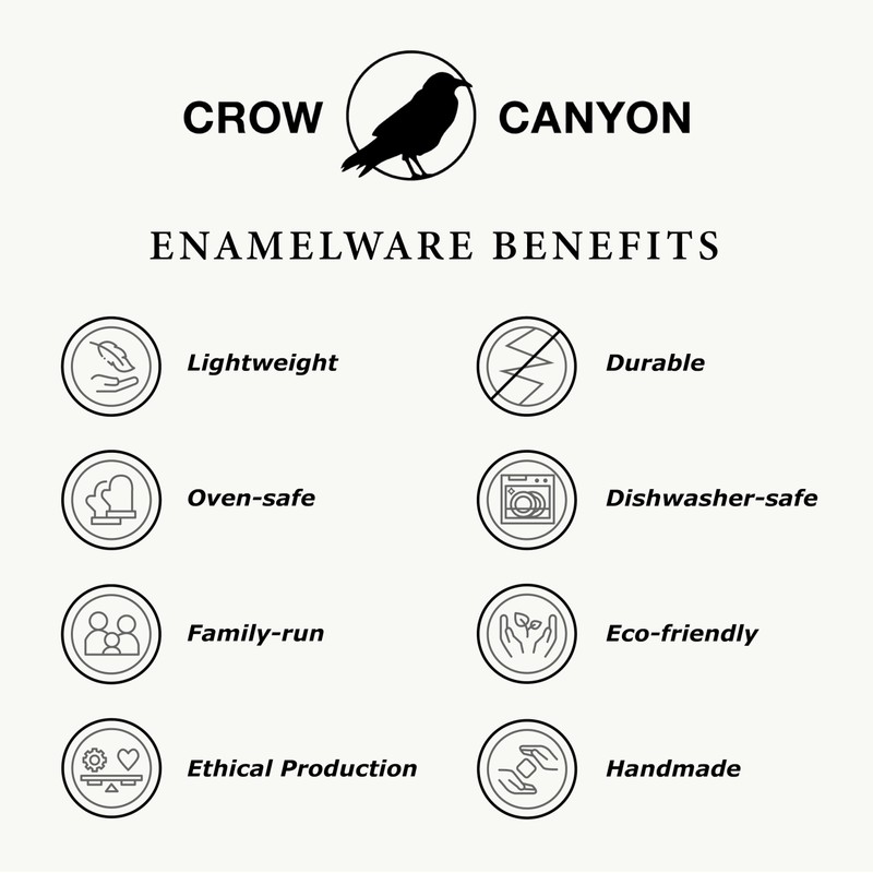 Care & Use Instructions: All Crow Canyon Home Enamelware is dishwasher safe and okay to use on a grill, stovetop, campfire, or in an oven. Enamelware is NOT intended for microwave use. Avoid using abrasive cleansers or hard water stain removers on its surface.