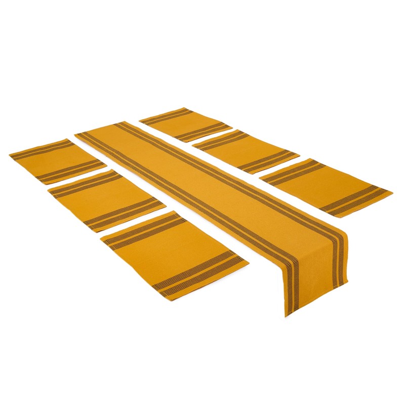 Encasa XO Table Runner and Placemats Set 6 | Fine Ribbed Cotton | Ladder Yellow | 1 Table Runner Size 32x183 cm & Each Table Mat Size 48x32 cm