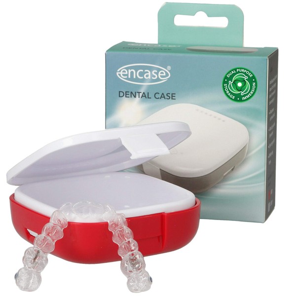 Encase Dental Retainer Case with Dental Bath – Dual Purpose Hygienic Denture Case for Storage and Immersion of Mouthguards, Ortho Retainers + Dental Appliances (Red)