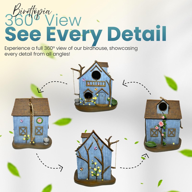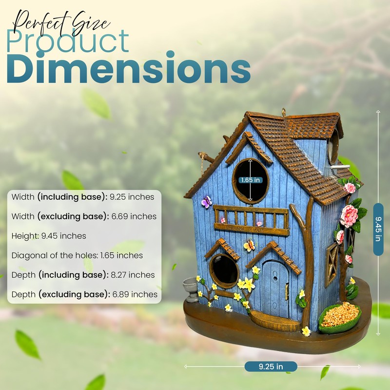 - * Practical Functionality With Style - The beautiful blue exterior adorned with decorative flowers, butterflies, and detailed trim makes this an eye-catching garden accent. The special openable cleaning door provides easy access for seasonal maintenance, ensuring a fresh, healthy environment for returning bird families.