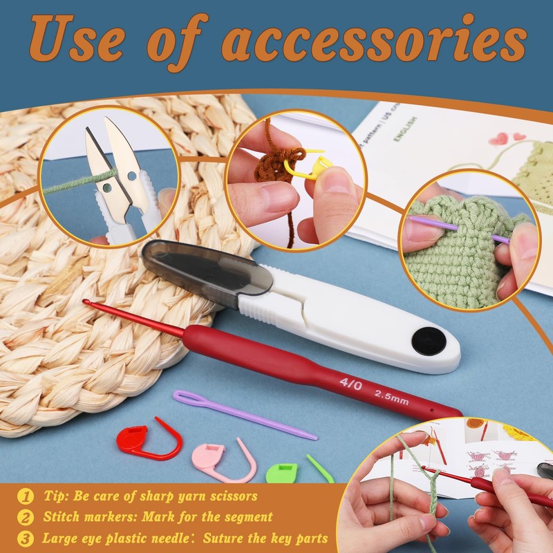 - Complete Crochet Kit: This is a crochet kit, not a finished product. The beginner's crochet kit includes: enough cotton thread, 2.5 mm red rubber shank aluminium crochet hook*1, 5.5 cm plastic big eye needle*1, stitch markers*3, and sewing scissors with transparent cover*1. In addition to the materials, the crochet kit also includes step-by-step video tutorials and crochet instructions, perfect for beginners.