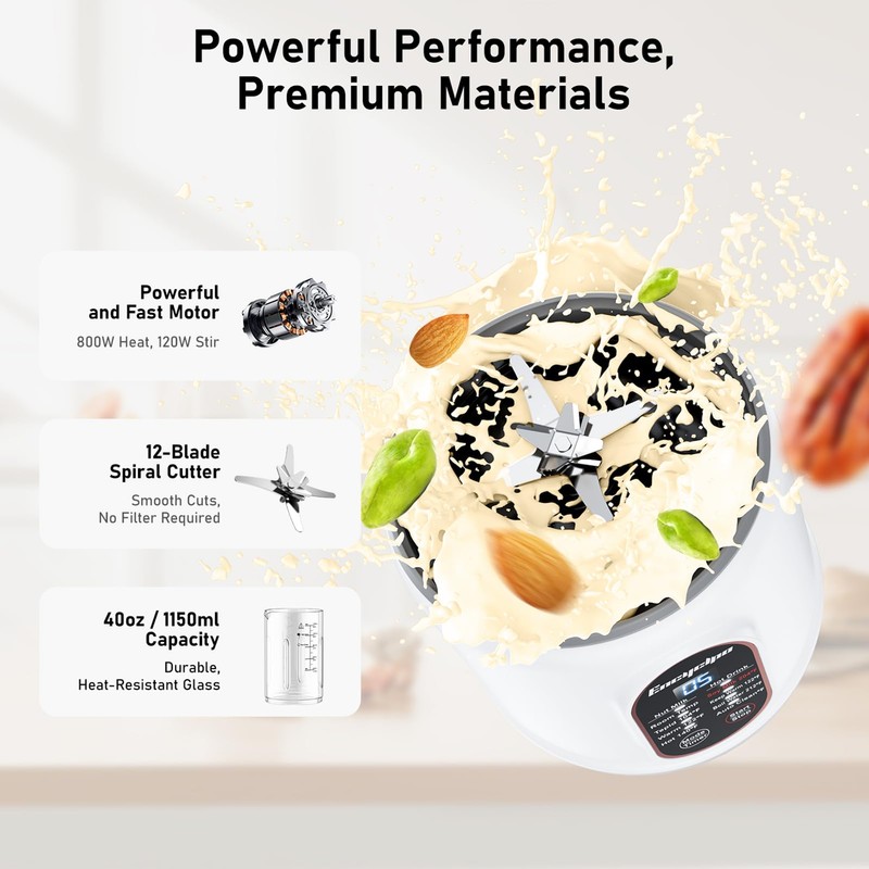 - 【No Soak, No Strain - Instant Smooth Plant Milk】Powered by a robust motor and 3-layer 12-blade stainless steel blades, our nut milk maker blends nuts, beans, and ingredients directly—no pre-soaking or straining required. Enjoy silky-smooth almond, soy, oat, or coconut milk in minutes, perfect for hot or cold beverages.