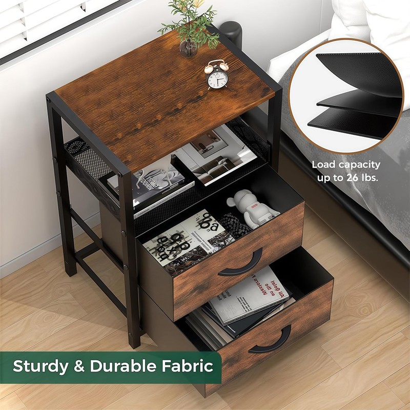 - ✅ 【𝗔𝗠𝗣𝗟𝗘 𝗦𝗧𝗢𝗥𝗔𝗚𝗘 𝗦𝗣𝗔𝗖𝗘】: Designed with two spacious drawer and an open shelf, this nightstand provides flexible storage for all your nighttime essentials. The fabric drawer offers a soft, organized space for personal items, while the open shelf is ideal for books, magazines, or decorative pieces. This end table ensures your belongings are neatly stored and easily accessible