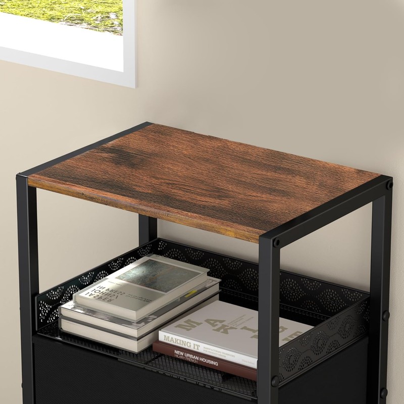 End Table with Fabric Drawer, Small Wooden Side Table, 4-Tier Nightstand with Mesh Shelf, Sofa Bedside Table for Small Spaces Dresser in Living Room, Bedroom, Open Shelf, Stable Frame, Easy Assembly