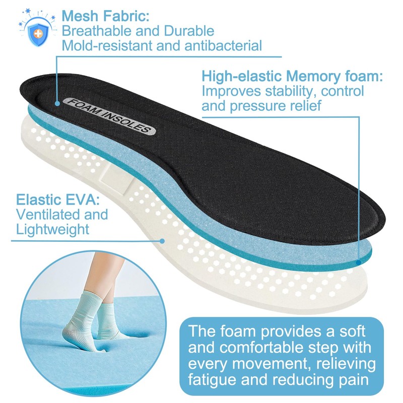 - Comfortable & Supportive: Our insoles contain 5mm high-elastic foam, which distributes impact evenly across the foot, enhances stability and control, and provides cushioning and pressure relief. Additionally, they are lightweight and durable, adding no extra burden to your movements.