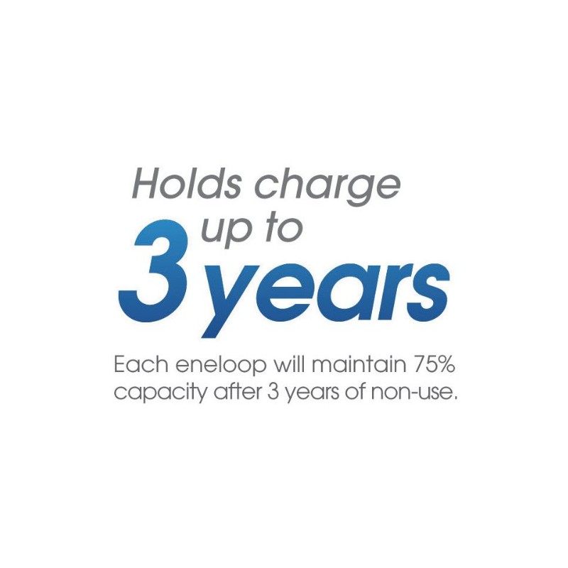 SANYO 1500 cycle rechargeable eneloop Ni-MH batteries maintain up to 75% of their charge after three years of storage compared to conventional rechargeable batteries which often have 0% charge after only 2 years of non- use.