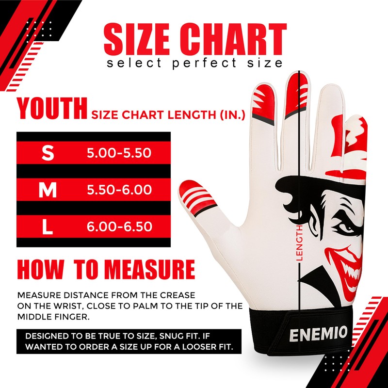 - Custom Fit for Every Player – Designed for comfort and optimal performance, our wide receiver gloves come in a wide range of sizes, from Youth Small to Youth Large. For a perfect fit, measure from the base of your palm to the tip of your middle finger. If you have wider hands, we recommend choosing a size up. Perfect for players of all ages and skill levels!
