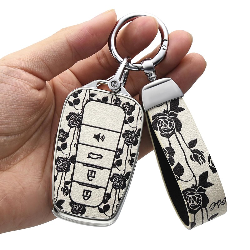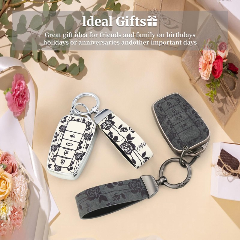 for Toyota Key Fob Cover with Keychain,Premium Soft TPU and Leather Key Case Protector Compatible with 2020-2022 Highlander Corolla Prius,2018-2024 RAV4 Camry Avalon C-HR GT86 (White Rose)