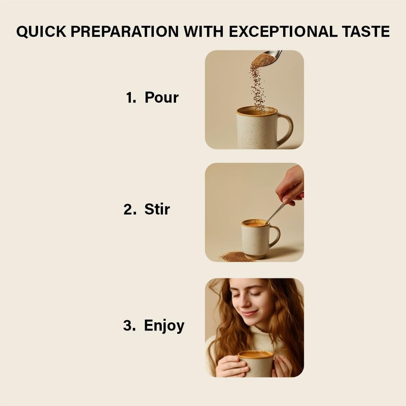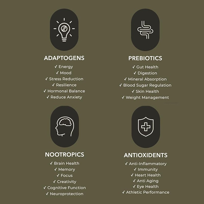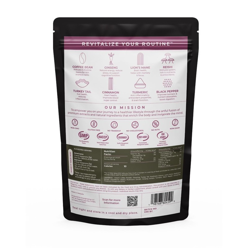 - Ginseng: An herbal adaptogen for energy Lion’s Mane: A nootropic for brain health, memory, and focus. Turkey Tail: A prebiotic for gut health. Reishi: Functional mushroom rich in nutrients and antioxidants. Turmeric: A rich antioxidant with anti-inflammatory properties supporting joint health. Black Pepper: Derived from a flowering vine used to enhance turmeric and nutrient absorption. Cinnamon: A spice that supports heart health and helps lower blood pressure. Robusta & Arabica beans: For a rich aroma & taste.