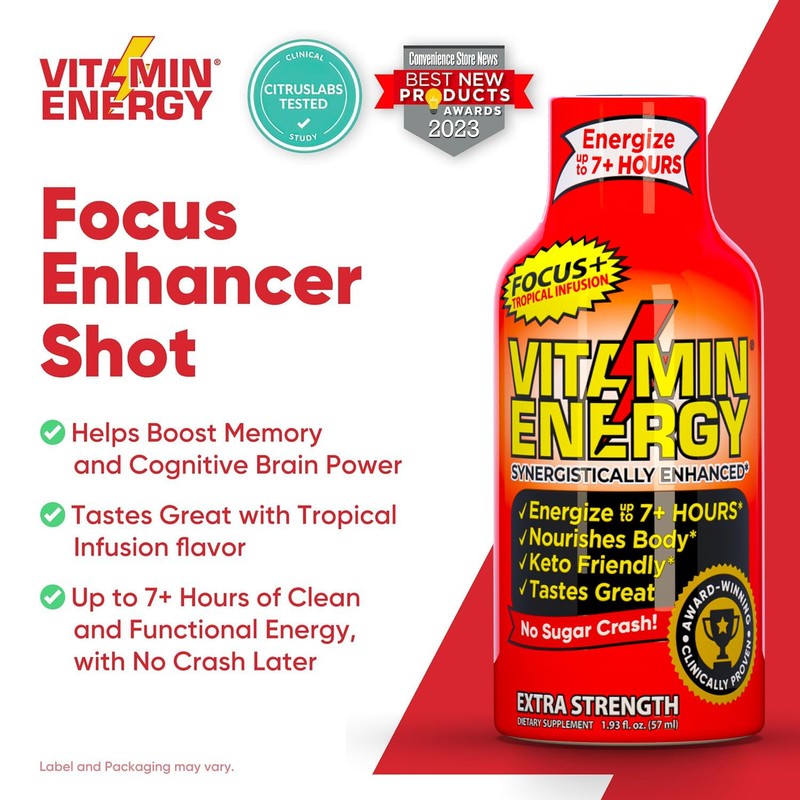- Powerful focus boost: At only 2 oz per bottle, Vitamin Energy shots are a convenient source of vitamins that boost energy and focus for up to 7+ hours; each sugar-free, low-calorie shot contains 260mg of natural caffeine and zero carbs