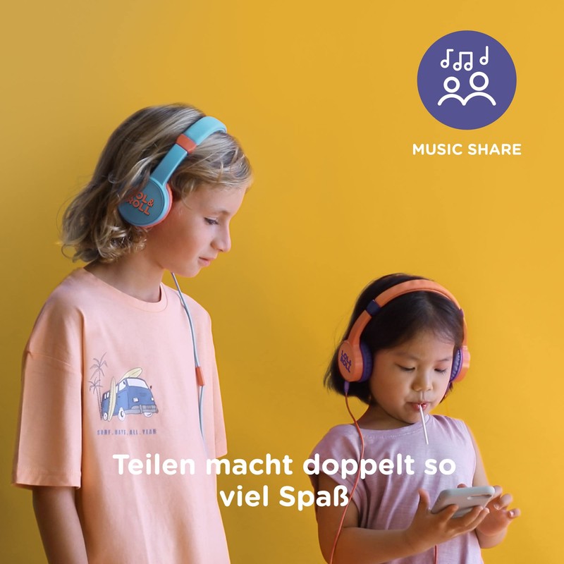 • Music Share: Kids headphones with Music Share function that connects two headphones together via the audio output jack to listen to music or multimedia content together.