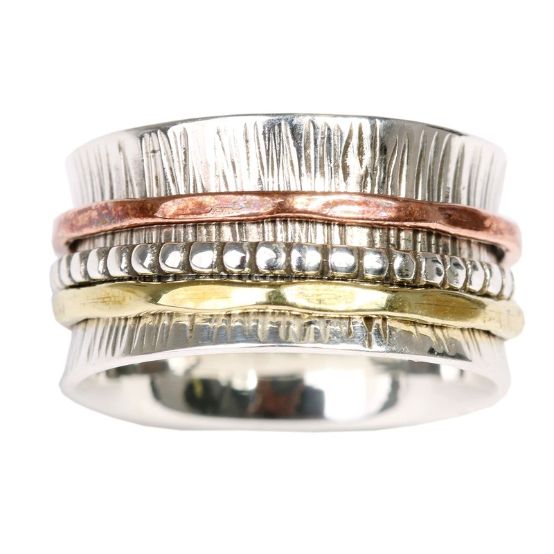 - ❁ CELEBRATING IMPERFECTION – Celebrating uniqueness and individuality, this Beautiful Imperfection ring has a freeform pattern in the base ring which sits under three spinners in copper, silver, and brass.