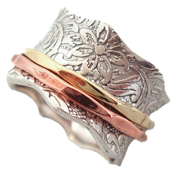 Energy Stone Balance and Beautiful Floral Rotating Meditation Ring (Style# 88), Sterling Silver